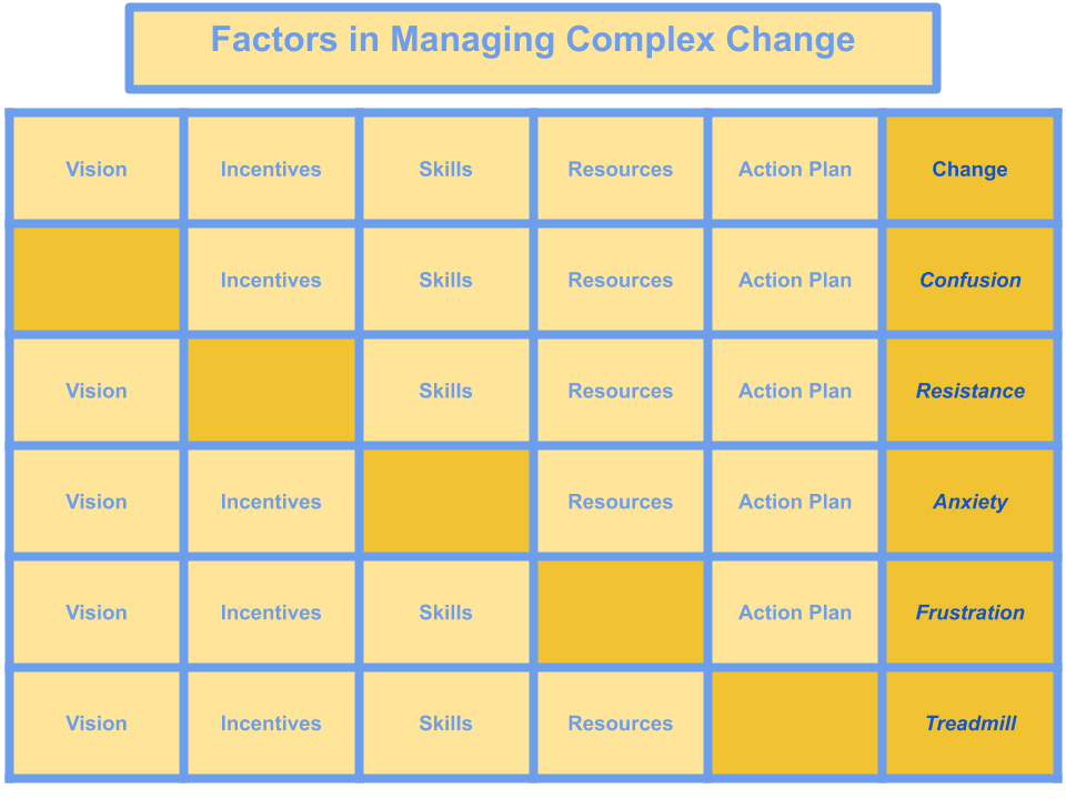 We may also feel the need to defend our “old ways” and then go back to doing what we have always done. Is having an issue with change justifiable? Absolutely! This justification can happen when something is missing. For change to be successful, many factors need to be in place. If a single factor is missing, we can feel some of the emotions mentioned earlier. A couple of weeks ago I attended an educational conference and the topic of change was discussed. One of the resources we were given was a chart that contained factors needed for change and the emotions we may feel when one or more of those factors are missing. I created a chart that I adapted from Ambrose, D. (1987), Managing Complex Change, as well as others I came across.