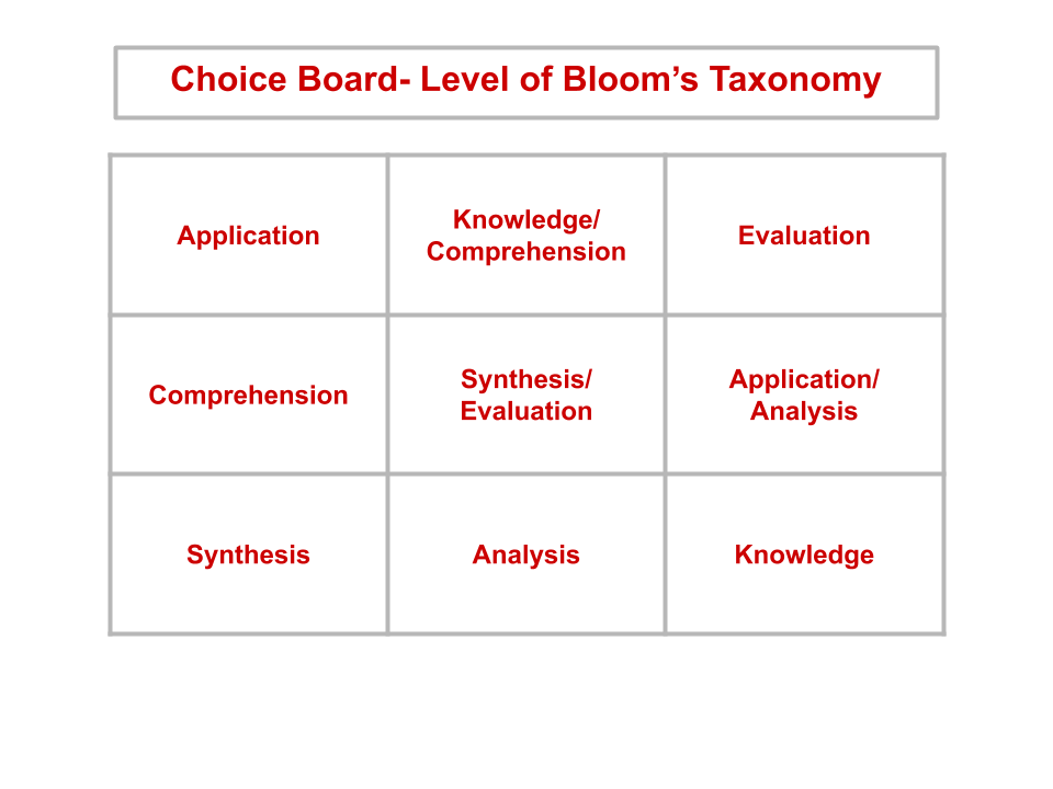 Choice board design should be centered around a particular learning target or essential standard. Once we have identified our learning targets and/or essential standards, we need to plan activities to provide students with a variety of mediums, methods, or learning styles that fit their educational needs. Look at some possible examples below: