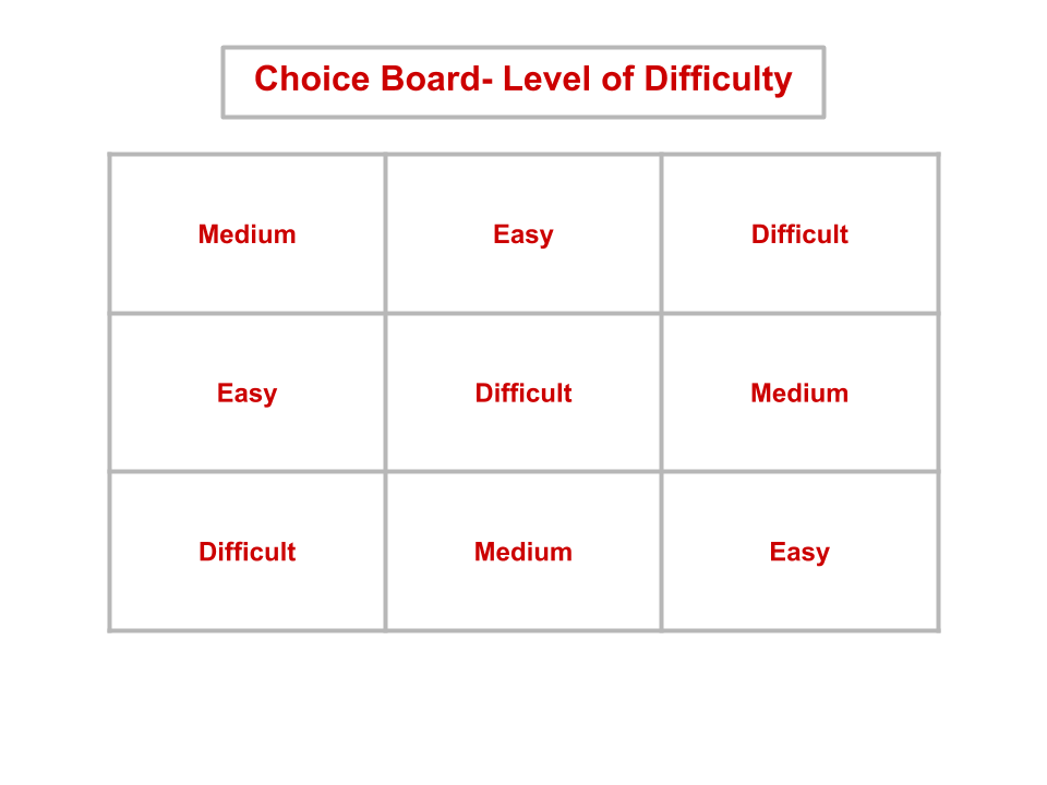 Simply, a choice board is a graphic organizer that contains a certain number of squares or choices. Each square or choice can be an activity, task, homework assignment, project, or an assessment. The possibilities are endless of how teachers can creatively and effectively design them.Using choice boards have many benefits. They allow students the power to “choose” which will encourage them to be more accountable and responsible for their learning. At the same time, the careful design of the boards can create unique opportunities for students that will aide in their different learning styles.