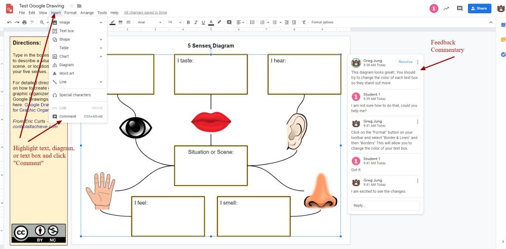 Fortunately, there are several applications that teachers, students, and administrators can use to effectively provide feedback.Google has done a terrific job of integrating ways to provide feedback in many of its G Suite applications. Google Docs, Slides, Sheets, and Drawings all have a built-in comment feature that can be used for giving feedback. Here are a few screenshots of each application and how you can access them.