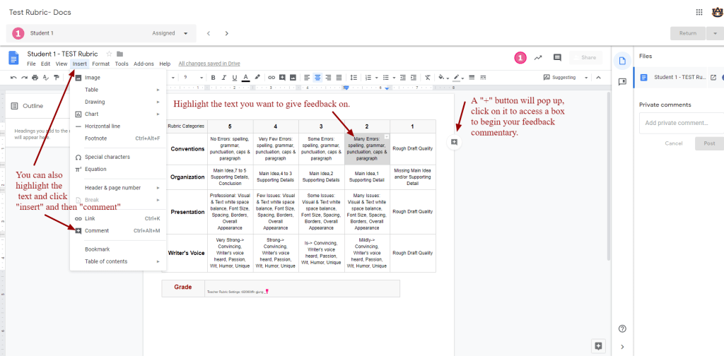 There is a great Google Doc add-on that is called Orange Slice Teacher Rubric. You can create a custom rubric or copy and paste an existing rubric into a Google Doc. Teachers can highlight the part of the rubric on how they scored and the teacher can provide immediate feedback to the student on why the teacher gave them a certain score on the rubric.