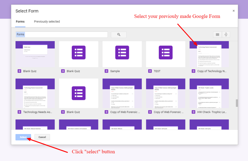 Step #2- Select your previously made Google Forms assessment with questions you want to use for your new spaced practice assessment.