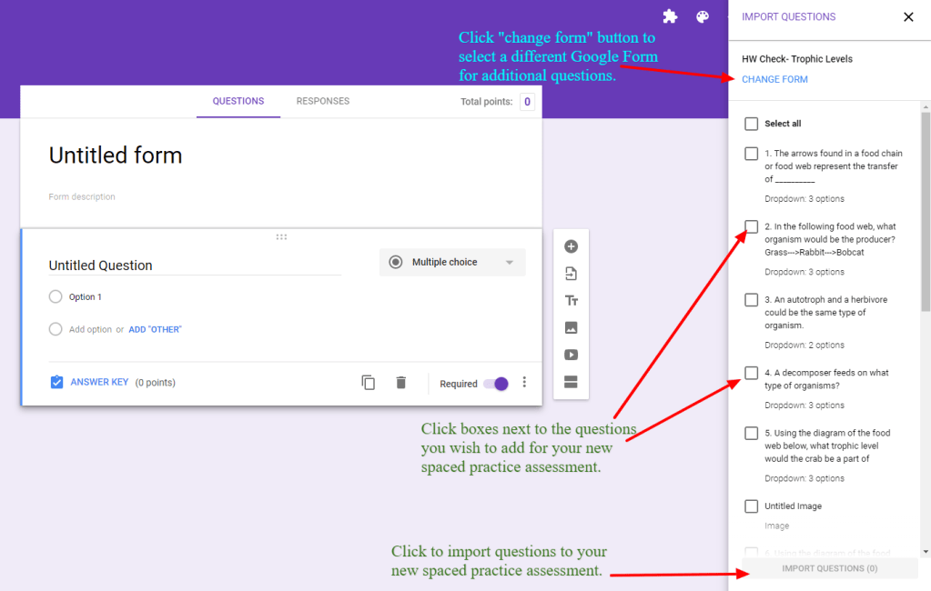 Step #3- Click the boxes of the questions you wish to add to your new spaced practice assessment. Click “Change Form” to select a different Google Form to add additional questions.