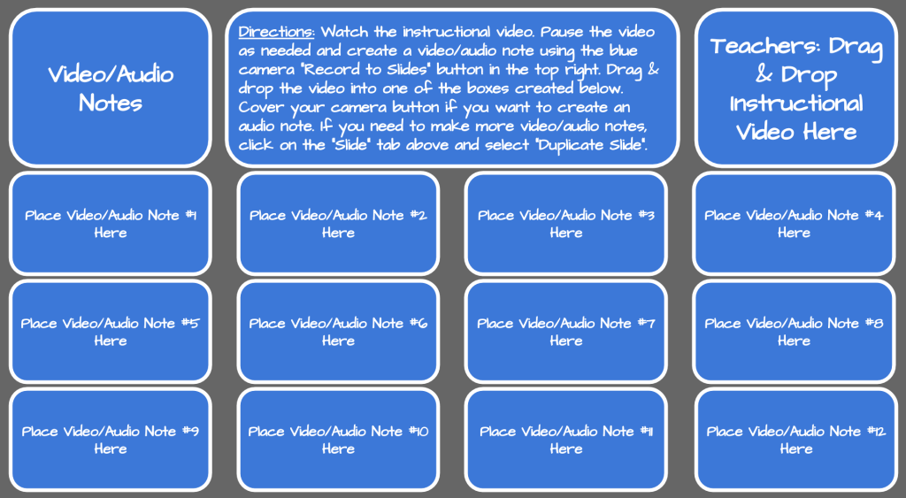 There are many ways students can record and represent new content. Sketchnoting, informal outlines, graphic organizers, and journals are a few of the popular options that teachers may give to students. Below is a template I created for students to engage in this instructional strategy by creating video or audio notes. There is a space in the upper right-hand corner of the template where teachers can create an instructional video with Record to Slides and drag and drop it into that area. Teachers could also use a video they created using Screencastify or a YouTube instructional video and insert it into the template.
